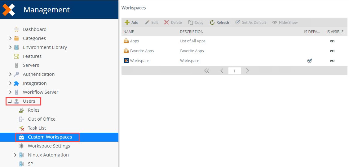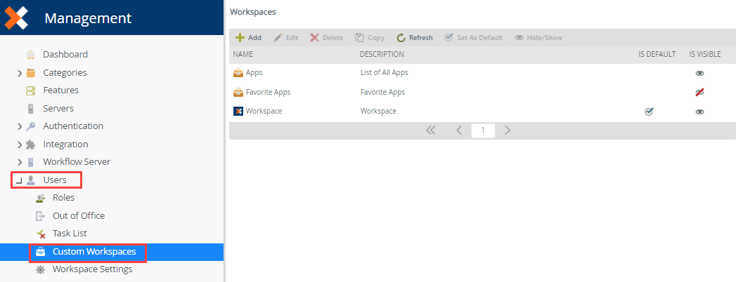 - From Management, browse to Users and select Custom Workspaces.