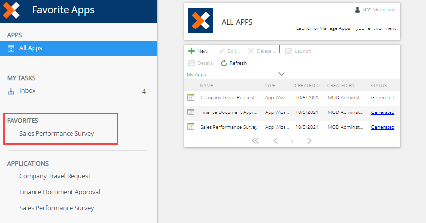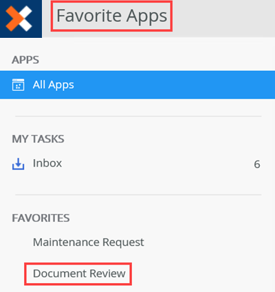 - The added favorites link shows in the Favorites section on the Favorite Apps workspace.