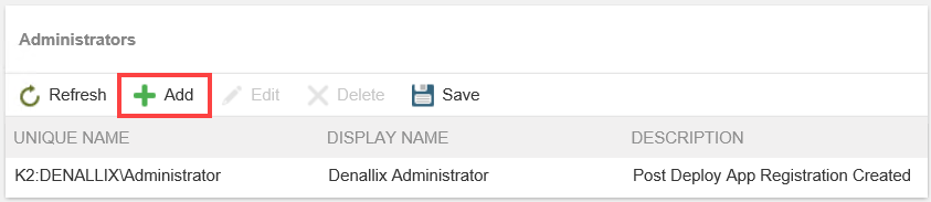 - From the Application: Administrators and Settings page, click Add in the Administrators section.