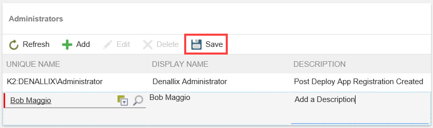 - Use the search feature or the picker control on the Unique Name field to find domain users to add as administrators. The Display Name auto populates with the user's name. In the Description field, type a detailed description. Click Save to add the selected user.