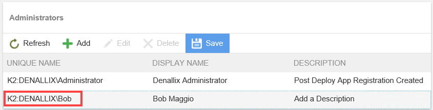 You cannot add a group of users, such as Finance or Human Resources, to the list. To add multiple users, select and add them individually. - In this example, Bob is added as an administrator for the application.