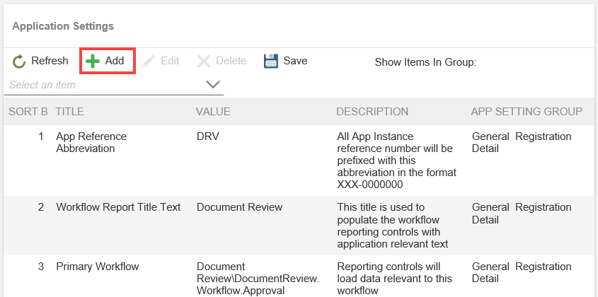 - From the Application: Administrators and Settings page, click the Add button in the Application Settings section.