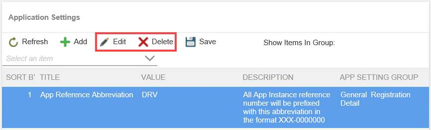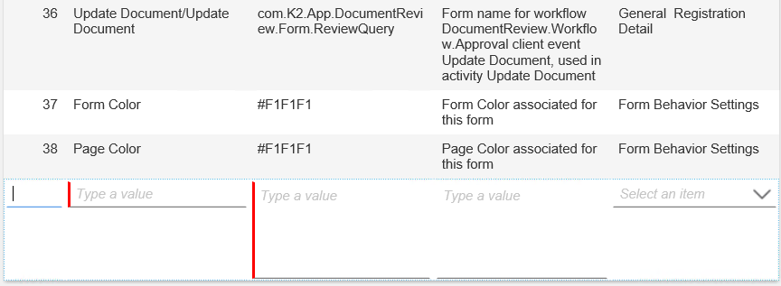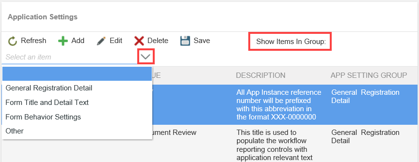 Application SettingsThis part of the app design makes it possible to alter some of the behavior and look of the app without having to open the pieces of the app in the designers. Items labeled Form Title or Form Detail allow you to change the text at the top part of each form. You can also set the form width or change the approval forms associated with a workflow without opening the Designer and changing it there. You can add, edit and delete app settings.