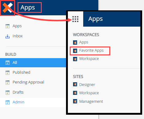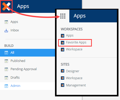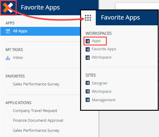 - To return to the Apps workspace, click the logo and select Favorite Apps workspace.