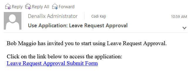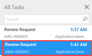Recipients receive task notifications in their workspace Inbox. Notice the subtitle displays the type of review requested. In the image below, there is a leave request review and a document review. Click the email title to display the request in the central pane.