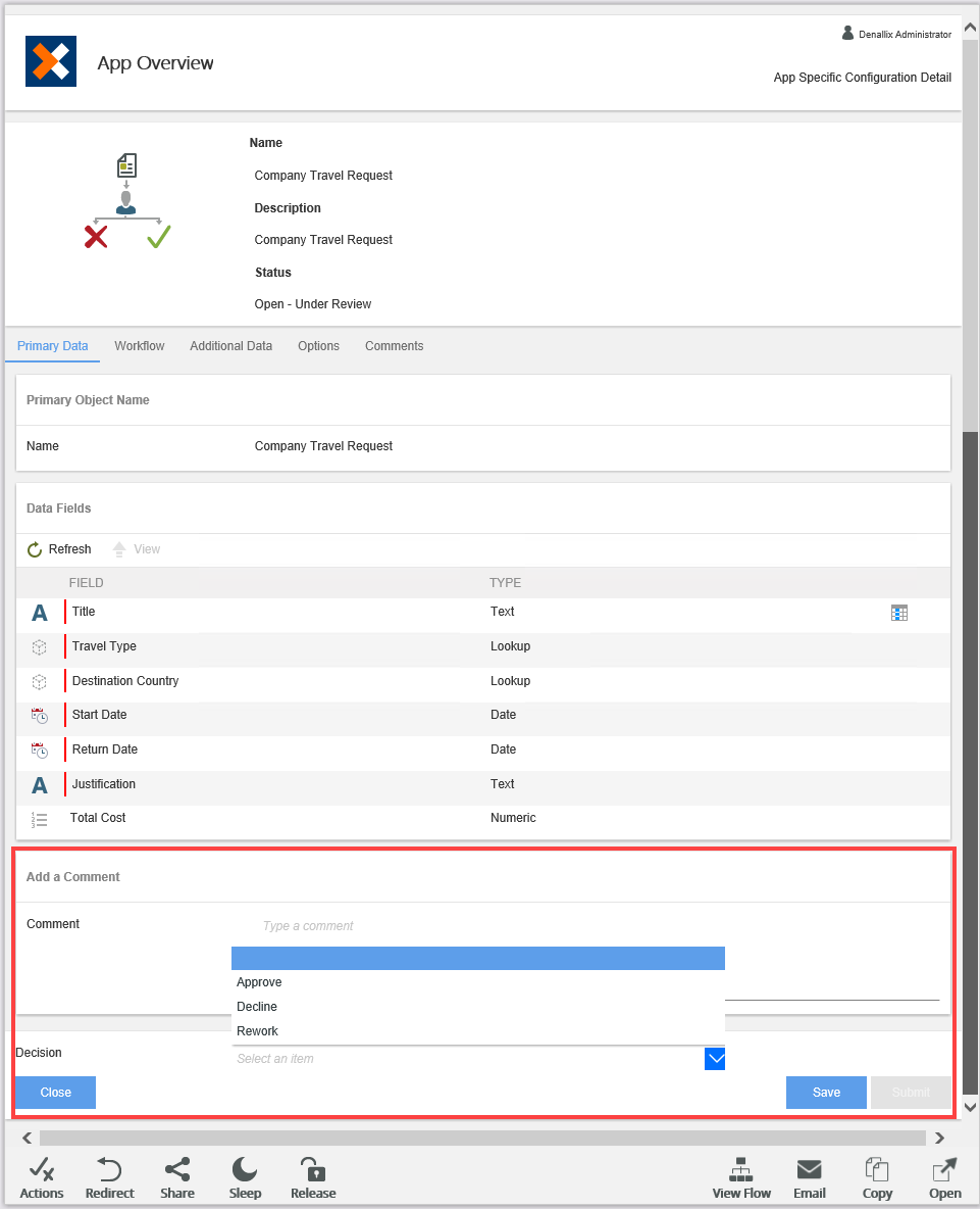 Review the request, then select the action from the Decision drop-down. Submit the request to save and send your decision.