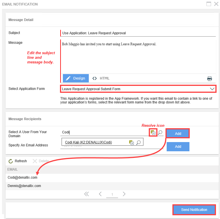 Edit the email subject line and message body. Select the request form link you want to appear in the email message. For the message recipients, enter a user name, then click Resolve. Click Add. Repeat this for each user you want to receive an invitation. When ready, click Send Notification.