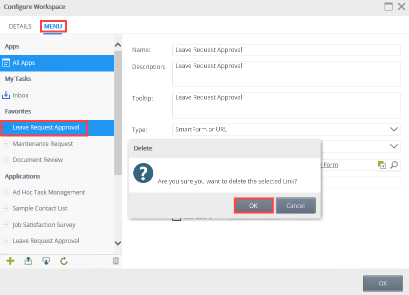 - From the Configure Workspace page, click the Menu tab. Select the favorite you want to remove and click the trash bin and click OK to confirm.
