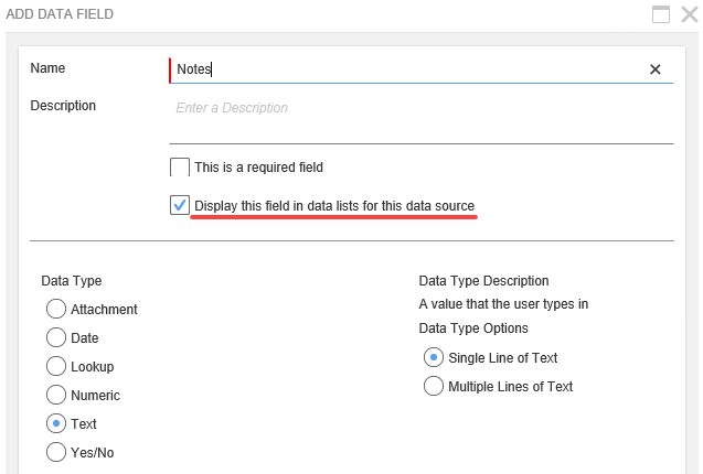 Enter a name and description for the new data field. Choose the data type and define the data options. You must include at least one data field in data lists for this data source. Behind the scenes, a list view is created for the new data source and displays it on the app form. The list view must have at least one column. Check the box to Display this field in data lists for this data source to include the current data field as a column. The list view must have at least one data field displayed. See the Template and Data Type Reference section for a complete list of available data types and options.