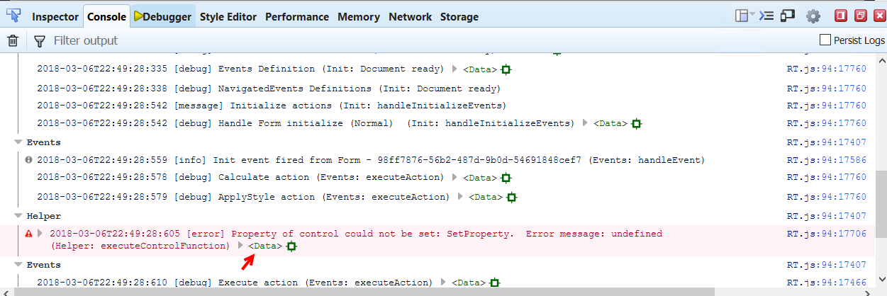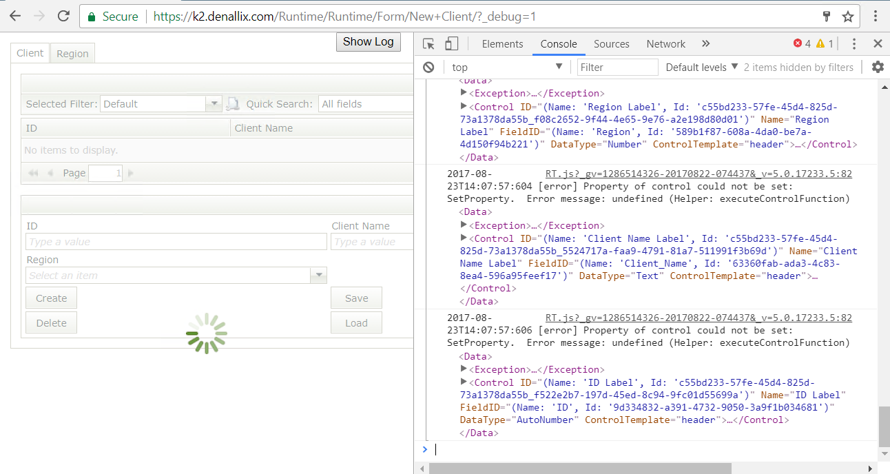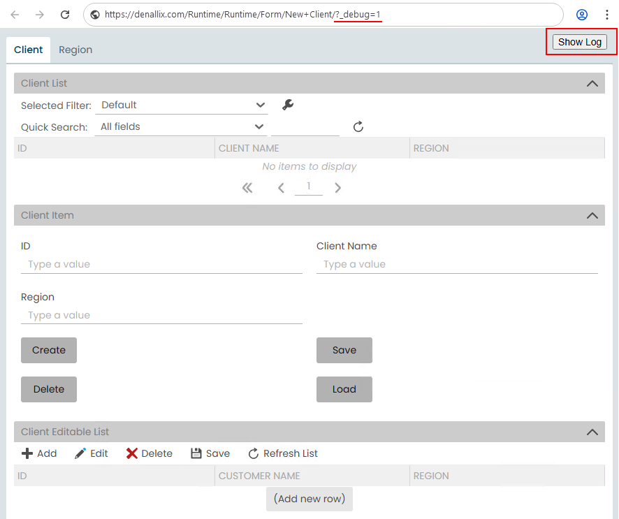 1. Add an extra query string parameter to the URL of your form: ?_debug=1. This value is the debug level, and you specify a level between one and five, for example, https://denallix.com/Runtime/Runtime/Form/New+Client/?_debug=3.