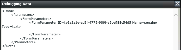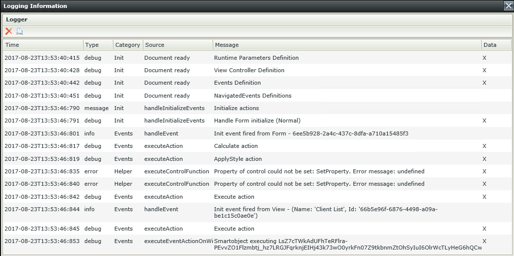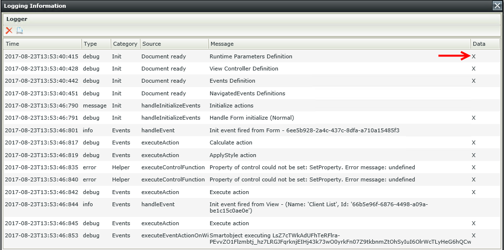 7. Rows containing data are marked by an x. When you double click one of these rows you see Debugging Data for the action executed as an example.
