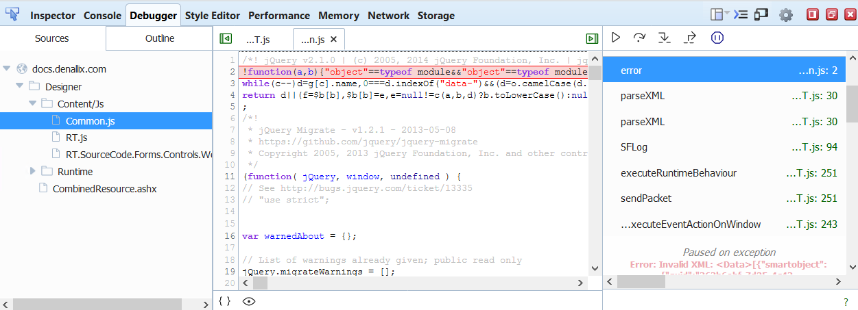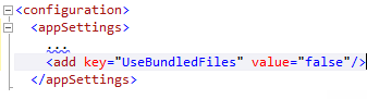 3. To get the correct stack trace you must change the runtime web.config file to turn off the minifying performance optimizations by changing the UseBundledFiles setting to false. Refresh the browser and recreate the error scenario. The stack trace points to the correct files or line numbers. Remember to change this value back to true once you are finished debugging. You can find the web.config file in the following location: