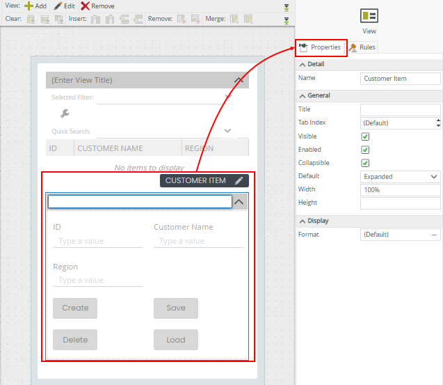 When you work with a view on a form, you can configure the view's properties on the form. Click the view to open the view's properties.