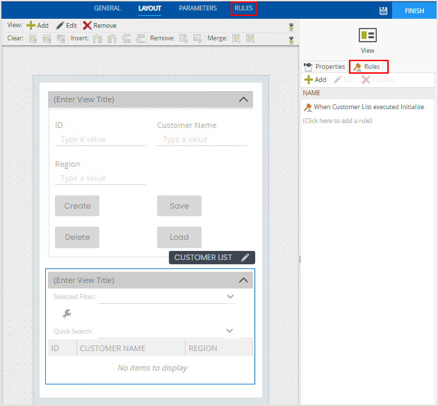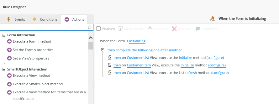 You can access rules by clicking on the Rules tab in the Properties menu of a control, view, and form, or click Add Rules on the Rules tab toolbar. The Rules Designer opens and allows you to configure rules, conditions, and actions of a rule that gives your form some interactivity and logic, such as calling a SmartObject method when the form initializes. You can configure rules for controls, views, and forms to create simple to complex business logic. See rules for detailed information about configuring rules, including information about rule inheritance.