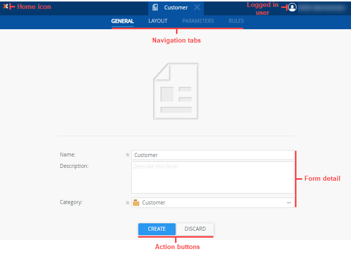 The form design canvas has multiple tabs to help you create your form. The General tab is active when you create a new form. Look at the following image to familiarize yourself with the main elements of the design canvas. See the following topic for more information on creating a form.