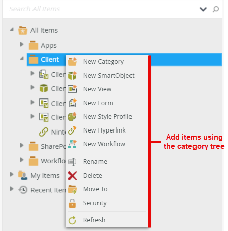 You can use one of the following methods to add new items (such as SmartObjects, views, forms, workflows, style profiles and hyperlinks) to the category tree: