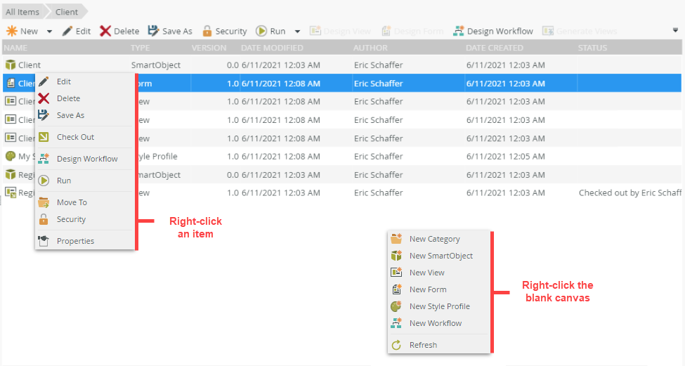 - Right-click anywhere in the blank spaces of the grid or on an item to open the context menu.