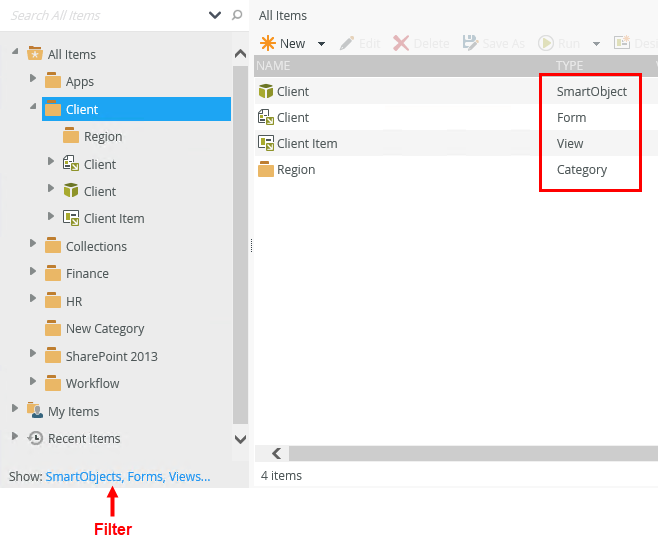 - Click the parent category in the category tree on the left to view all items and folders (sub-categories) on the right.