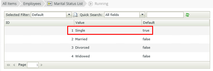 The image below shows a view using the Default property of the Marital Status SmartObject to display the default value of Single. See the How to use the default value section for information on how to use the default value with the control.