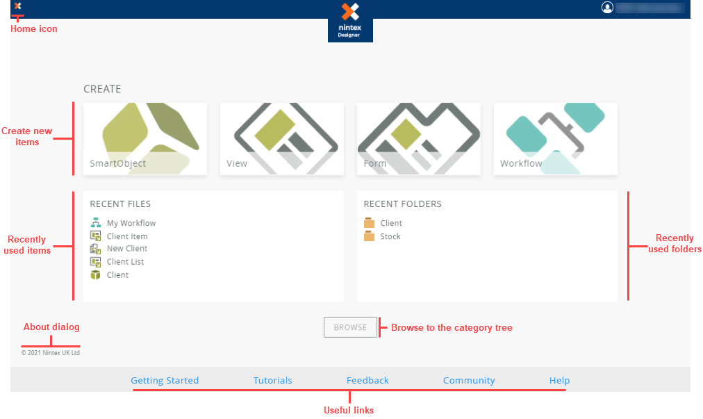 This section allows you to quickly access recently used items, such as SmartObjects, views, forms, workflows, and style profiles that you've recently opened.