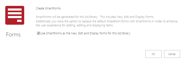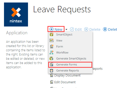 If you have already created an application for a list or library, you can use the Generate Forms menu option to create or re-generate SmartForms for the application and decide whether to use SmartForms as the New, Edit, and Display forms for the list/library. If the list or library definition changes (for example, a column is added to the list), you will need to re-generate the SmartObjects, forms, and views to discover and expose these changes in the application. For additional information on this, see Change a SharePoint list or library.