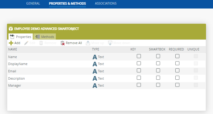 SmartObject properties define the data 'fields' of the SmartObject, similar to columns in a database or spreadsheet. SmartObject properties are most often associated with data required by, or returned by, SmartObject methods. This is known as binding: you 'map' or 'bind' a field returned by a method, to a property of that SmartObject. When editing a SmartObject in advanced mode, you can edit the properties for that SmartObject in the Properties tab, as shown below: