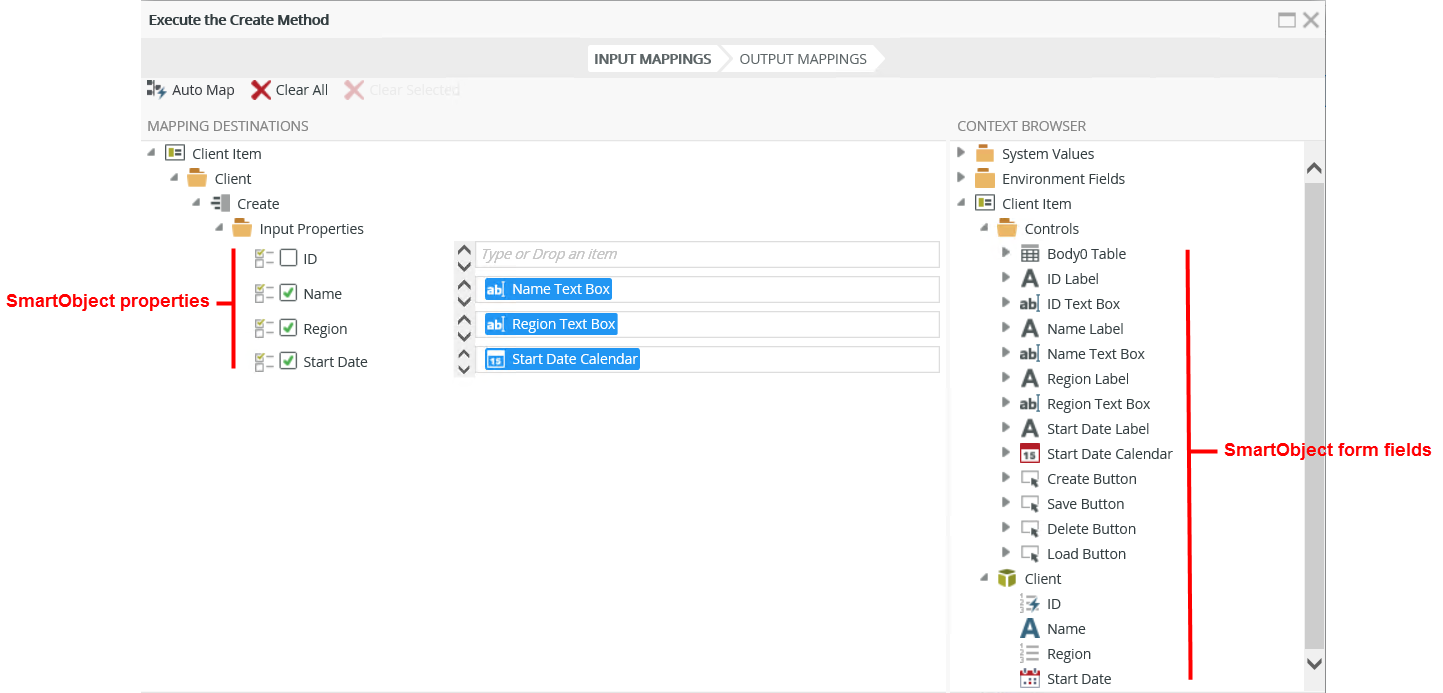 Fields are automatically mapped to matching SmartObject properties when you are configuring SmartObject methods. You can override these automatic mappings to, for example, change the data or exclude some fields. If you automatically generate the view, the rules and rule mappings are created for you. The next example below shows how controls are mapped to input properties. The value in the Name Text Box control is used as the input value for the Create method of the Client Item SmartObject. The other controls are mapped to the matching input properties as well in the Rule Designer .