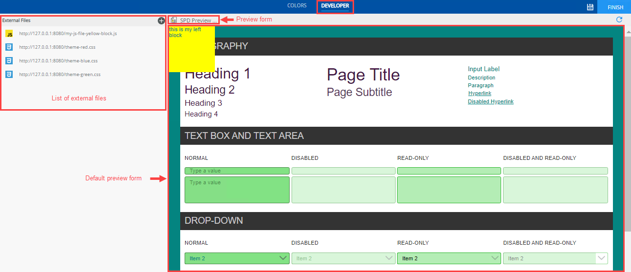 The preview pane contains a default form with some styling and controls to show the application of your changes in the linked CSS and JS files. You can use the default preview form or select your own SmartForm to test your changes in the Style Profile Designer. Click the SPD Preview button to select your own SmartForm for preview. The preview form includes the color changes you make in the Colors tab and the linked files in the Developer tab. The last three forms you opened show in the drop-down and you can choose to Reset to Default Form.