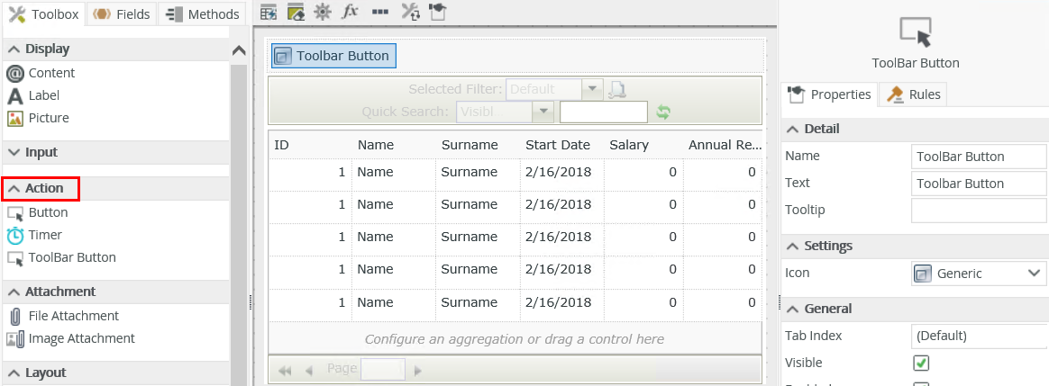 - Edit the List view and drag the Toolbar Button control onto the canvas. The control is available in the Action section of the Toolbox.