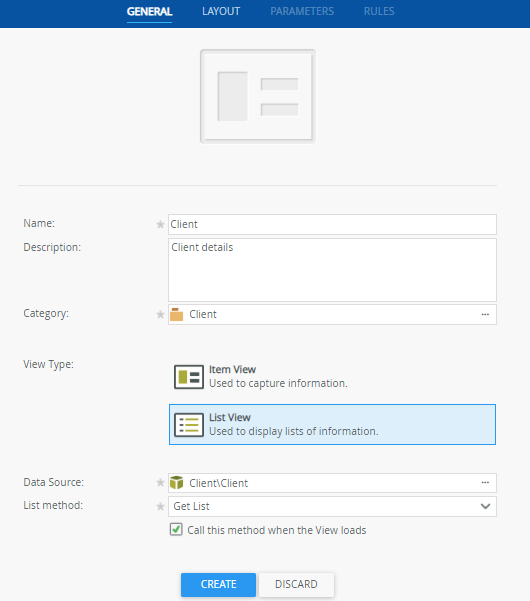 The General tab contains information about the view, the type of view you're creating, and the data source used in the view. When you select to create a List View, you see an additional option called List Method (refer to the second image).