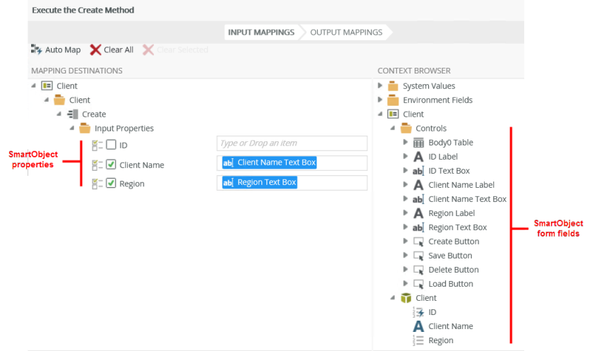Below is an example of the different fields when using the Rule Designer to map fields on the Input Mappings page, where values from the controls are used to call the Create SmartObject method which stores the values. In this case, the ID of the record is created as a result of executing the create method, and so the ID isn't included on the form: