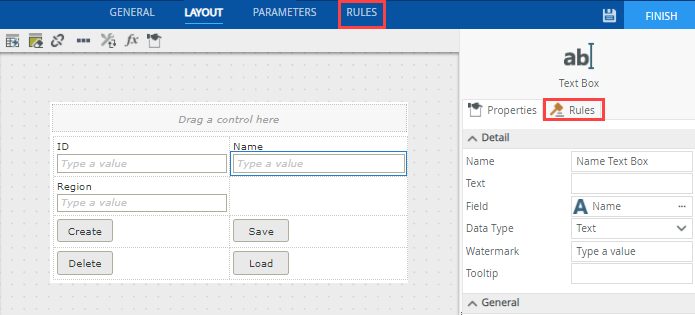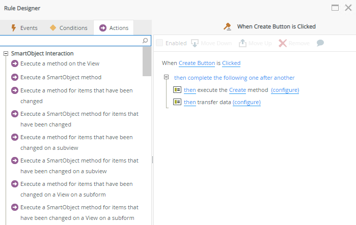 You can access rules by clicking on the Rules tab in the Properties menu of a control, or click Add Rules on the Rules tab toolbar. The Rule Designer displayed when you do this allows you to configure rules, conditions, and actions of a rule that gives your view some interactivity and logic, such as calling a SmartObject method when a button is clicked. You can configure rules for controls, views, and forms to create simple to complex business logic. See the rules topic for detailed information about configuring rules, including information about rule inheritance.