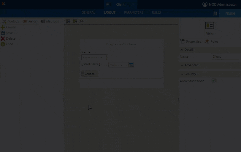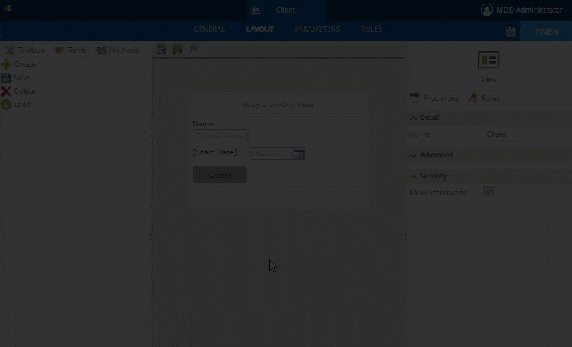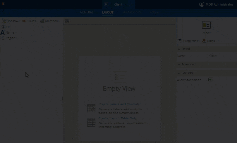 • Controls - The Toolbox tab includes common controls such as buttons, text boxes, and attachment controls. Use these controls and bind them to SmartObject properties (fields), or keep them unbound and use them with rules.