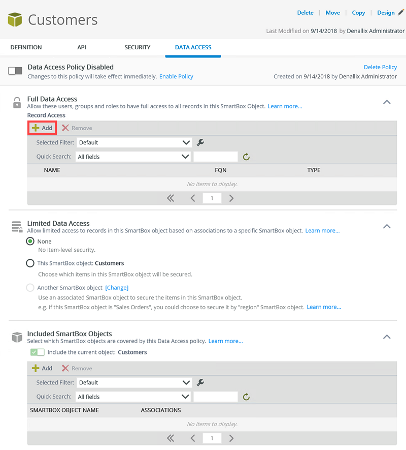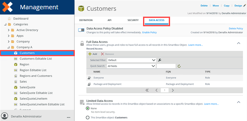 Follow the steps below to apply a Data Access policy with Full Data Access for Anthony on the Customers SmartBox SmartObjects.