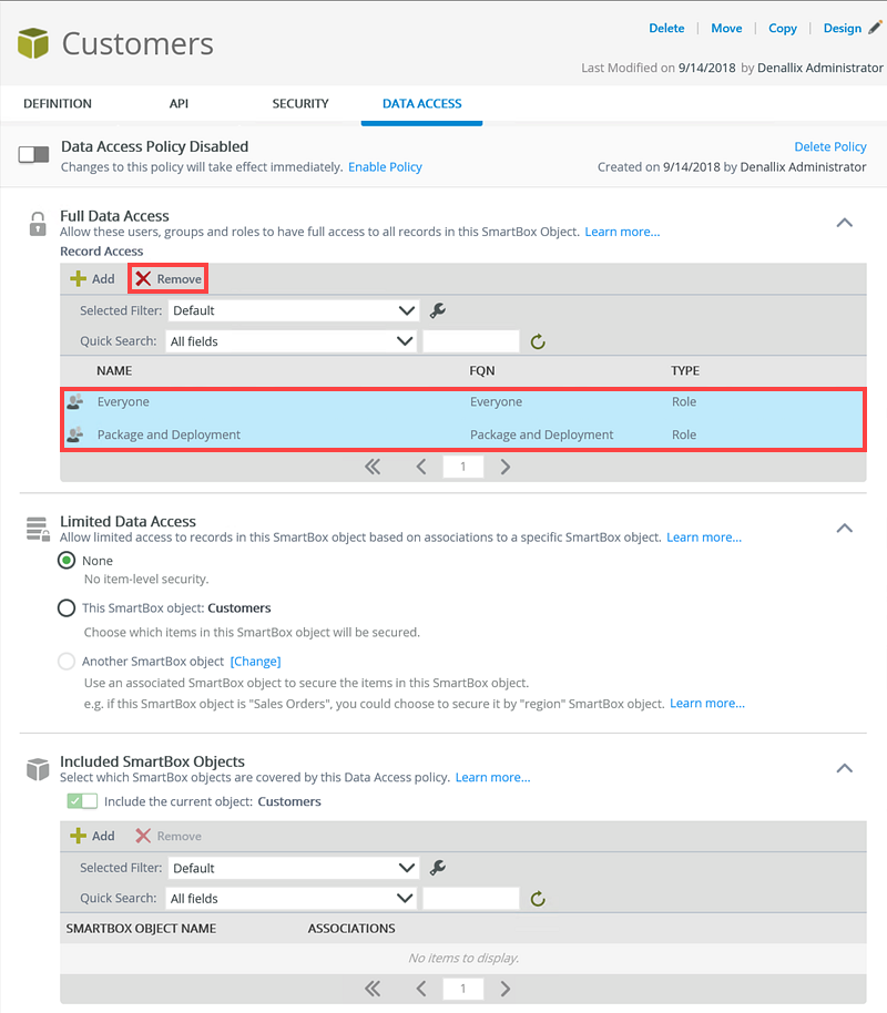By default, the Everyone and Package and Deployment roles are added to the Full Data Access section of the Data Access tab. Remove these if desired. - On the Full Data Access section, remove the Everyone and Package and Deployment role, as you only want Customer Success Team - Global Manager role to have Full Data Access on this policy for the Customers SmartBox SmartObject.