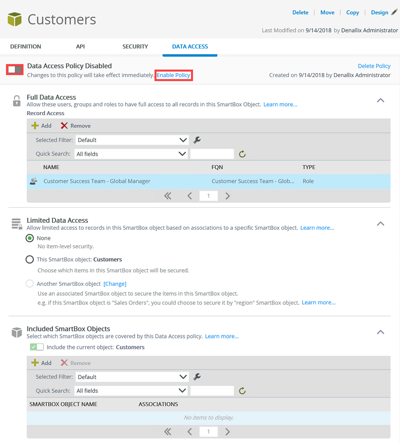 - Once you add the Customer Success Team - Global Manager role to the Full Data Access section of the policy, enable the policy by clicking Enable Policy.