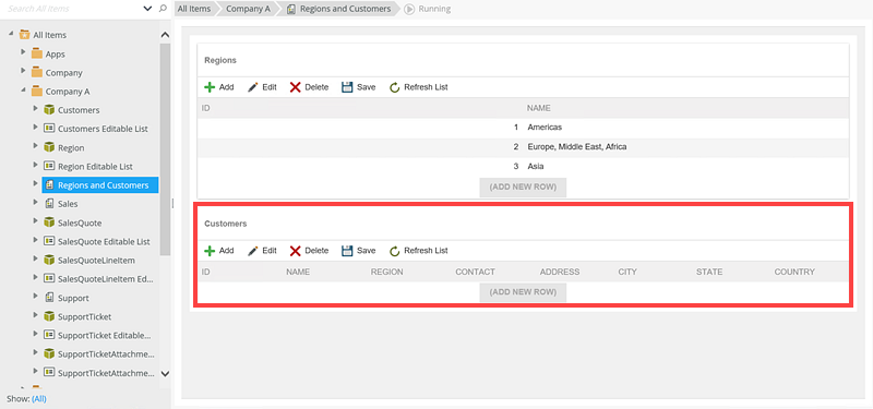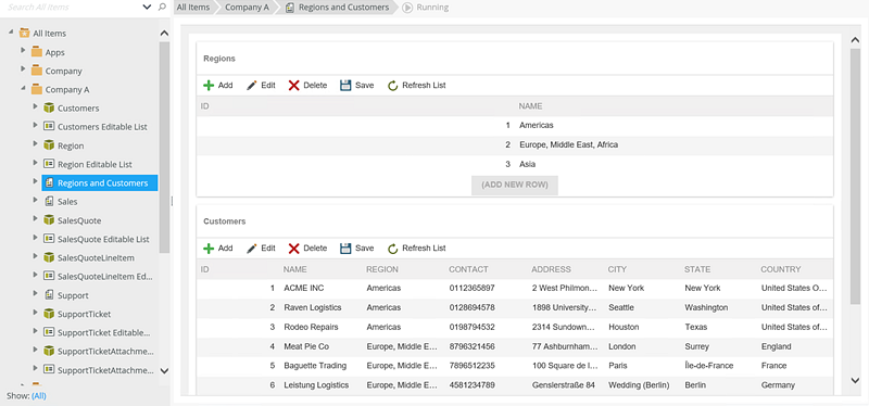 - On a form called Regions and Customers, the Region and Customers SmartObjects data is displayed. When Anthony runs the form, he sees all the data in the Region and Customers SmartBox SmartObjects.