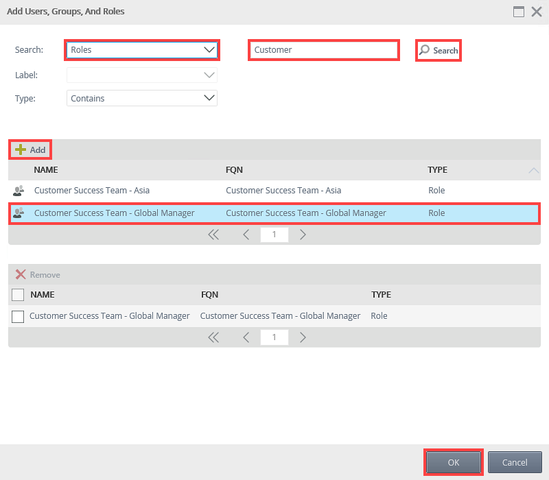 - On the Add Users, Groups, And Roles page search and add the Customer Success Team - Global Manager role to the policy. Click OK.