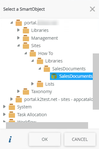 8. Click select SmartObject and then select your SharePoint library's SmartObject. In this scenario it is SalesDocuments.