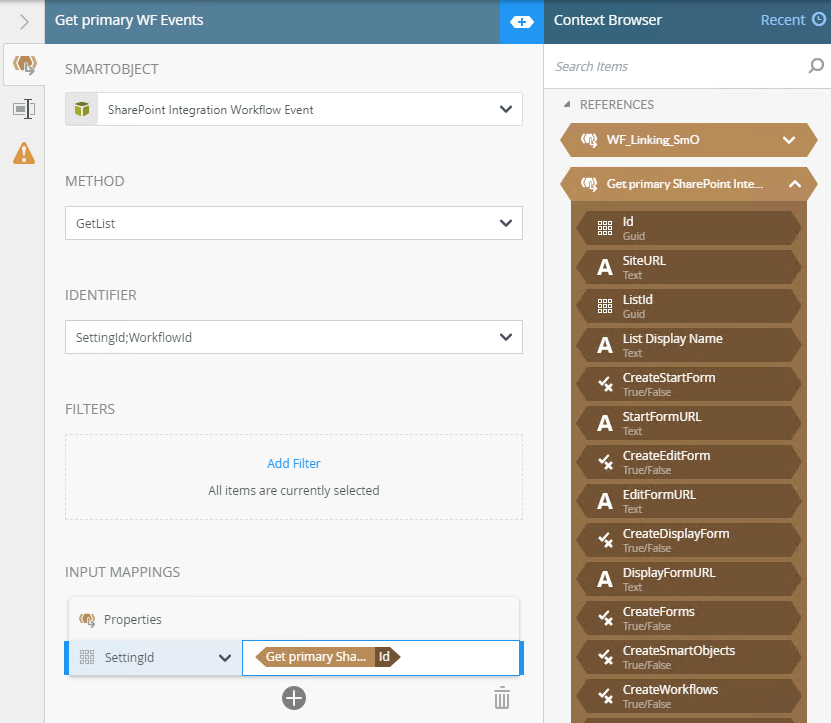7. Expand the context browser and drag and drop Primary Site URL and Primary List ID from the WF_Linking_Smo SmartObject reference to the matching input properties.