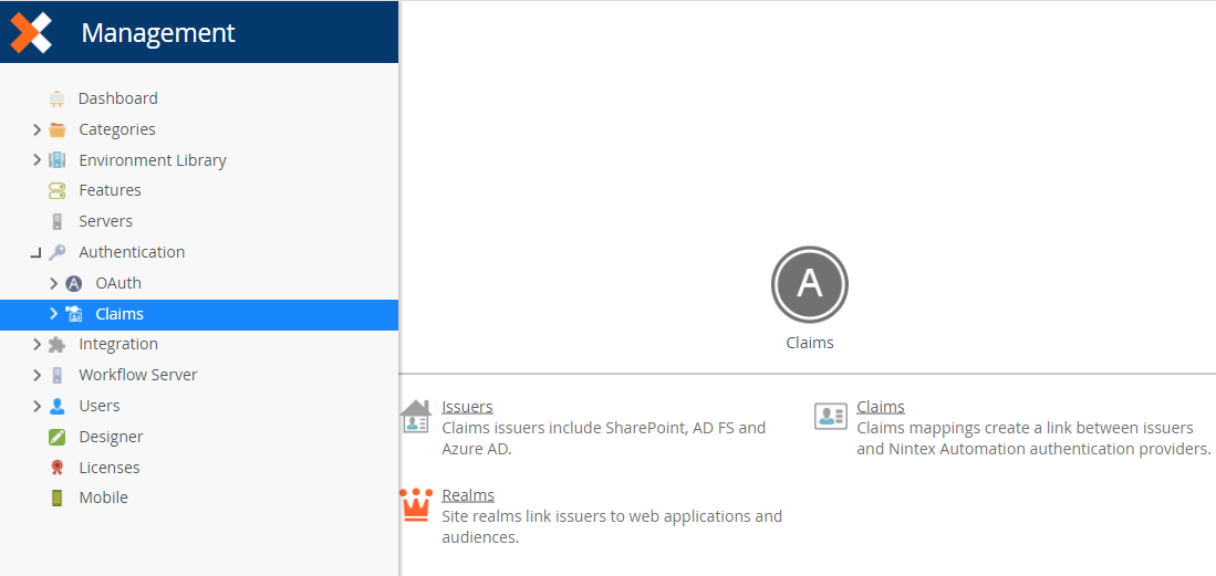 The Claims nodes in the Management Site are used to set up and maintain CBA configuration settings and allow you to add, edit or delete Resource types, Resources, and Realms and audiences , all of which work together to allow the product to consume Claims as a Relying Party from a CBA-capable identity provider.