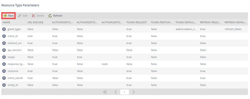 You can add, edit or delete resource types and their corresponding parameters. (Note that parameters only display after selecting a resource type, since parameters are specific to a resource type.) Each OAuth system may have unique parameters within the OAuth protocol, and each parameter used for requesting and responding must be defined.