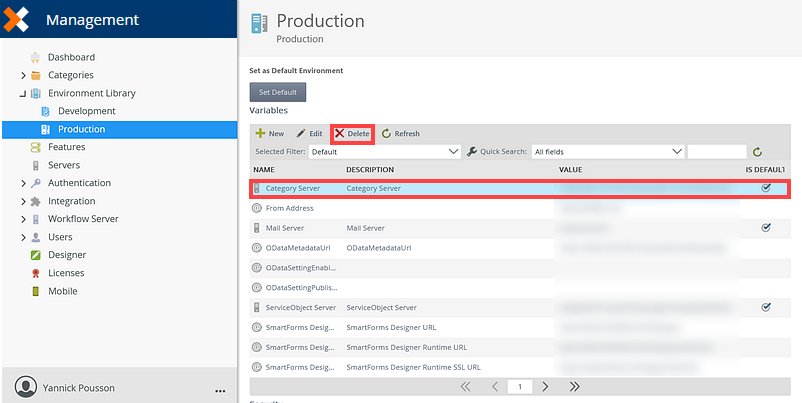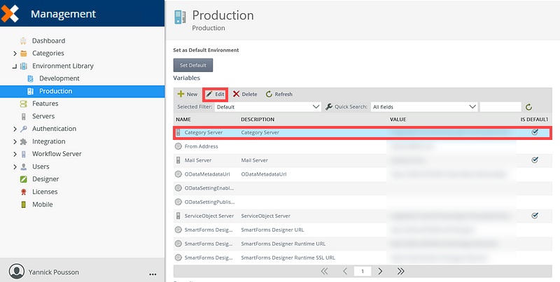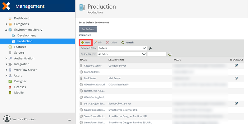 The Environment Library will contain nodes for each environment that has been defined in the current environment, and from here you can configure the environment's variables and security.