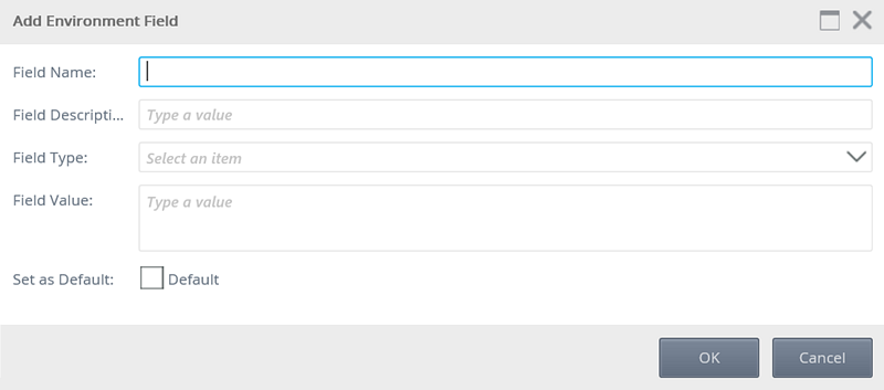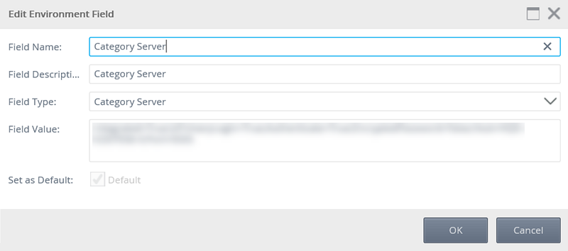 Field Description Sample Value Field Name The name of Environment Field. (Any text value that describes the name for this Field) Field Description The description of the Environment Field (Any text value that described the purpose of the Field) Field Type Specify the Environment Field Type via the drop-down. If applicable, select the type of field. For your own custom fields, use the Miscellaneous option. Field Value Specify the Environment Field Value (The replacement value for the Field) Set as Default Indicates whether or not the Field is used within the default Template. N/A If the variable contains the word 'server' then a server icon displays in the Name column of the variable, if not then a @ icon displays. - Click OK.