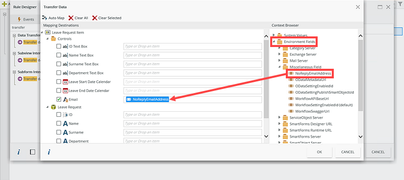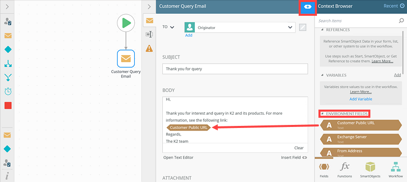 When building workflows or SmartForms, designers you may need to interact with different environment fields. Here is an example: Perhaps you want to use a custom environment field in the email step in your workflow.