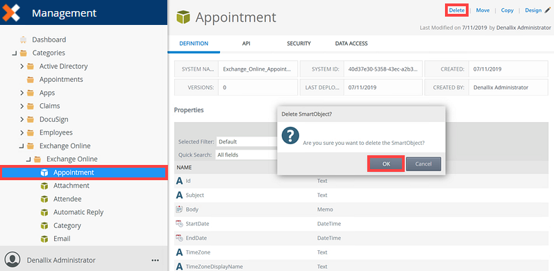 - Open Management and select the Exchange Online category in the Categories node. Delete all SmartObjects in the Exchange Online category. Select each SmartObject and click Delete.