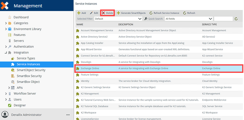 - Open Management and select Integration then Service Instances node. Select Exchange Online, click Delete.