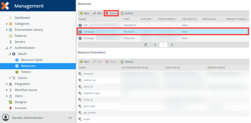 - Open Management, select Authentication > OAuth > Resources. Select the correct Exchange Online resource and click Delete.