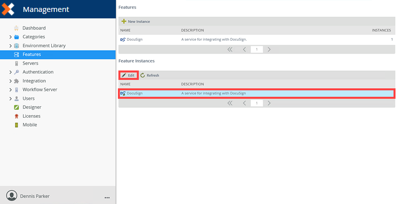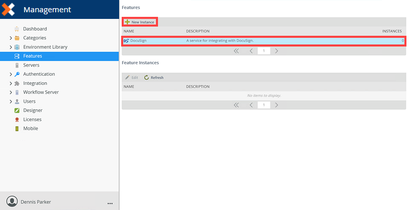 - Once the Feature page has opened, click on DocuSign and click New Instance.