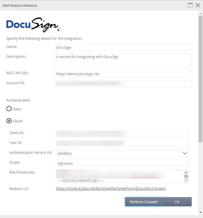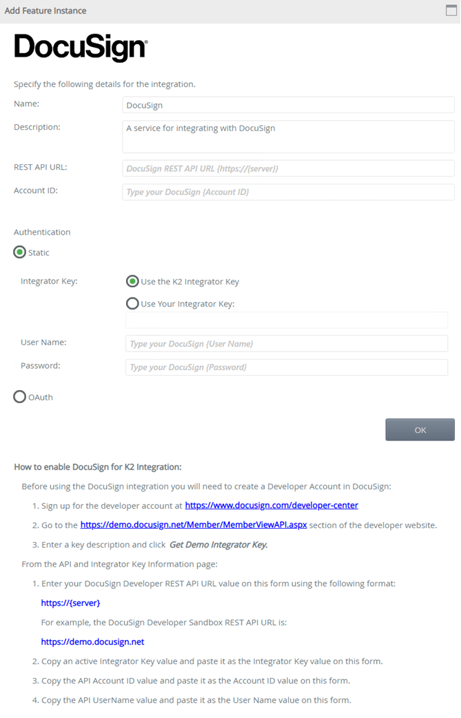 - The Add Feature Instance page opens. Follow the How to enable DocuSign for K2 Integration steps that appear on the window. Once all the values have been entered click OK.